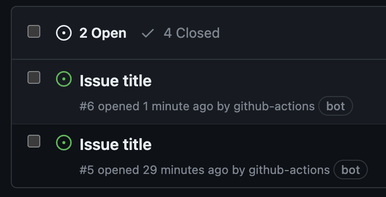 이 예제 워크플로에서는 GITHUB_TOKEN을 사용해서 새 Issue를 오픈합니다. Github Enterprise Server에서는 이슈 생성한 유저 이름이 github-actions로 찍힙니다.